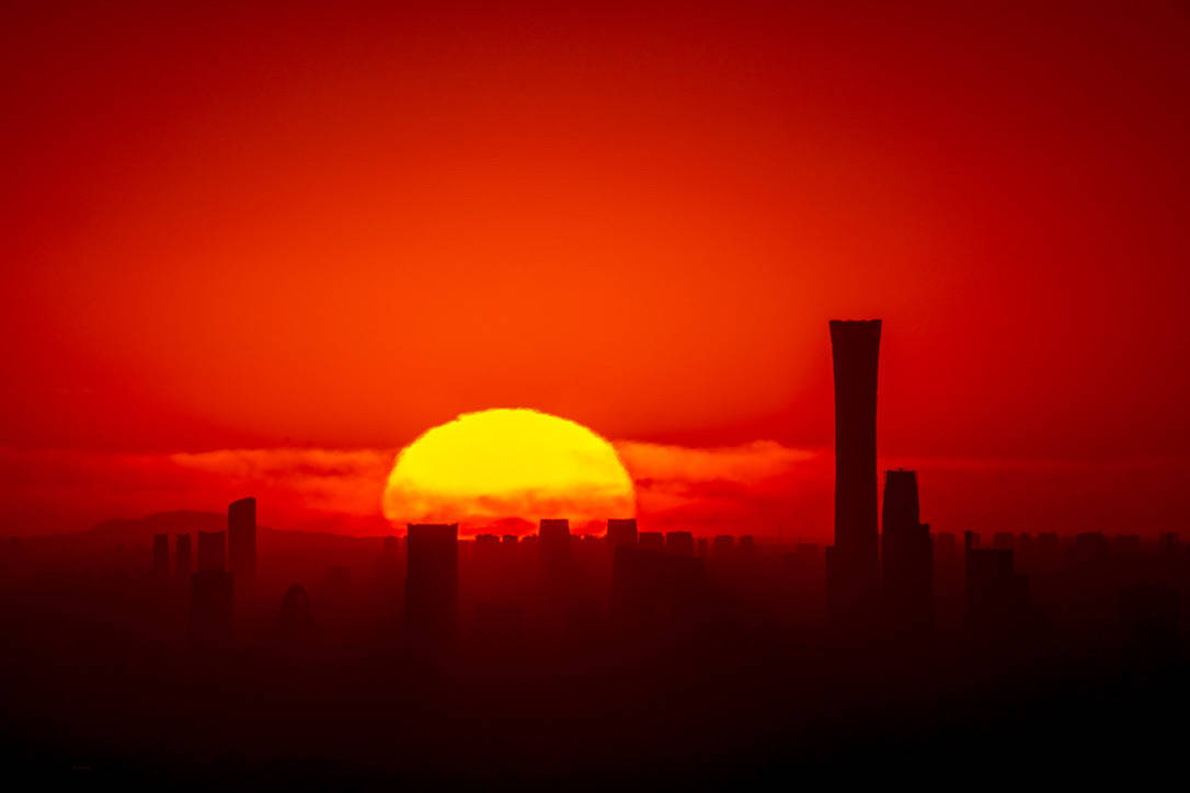 2024年9月22日正值秋分,当天日出时,在北京市石景山区拍摄的“悬日”景观。(王俊峰 摄)