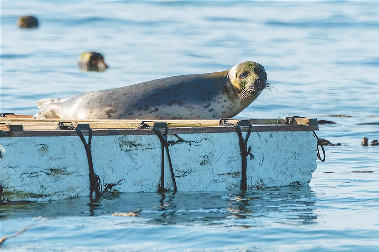 拍摄于2024.8。去年8月25日,斑海豹“阿侬”在泡沫浮漂休息,当时的它身体还是灰白色。通讯员 符宝 摄